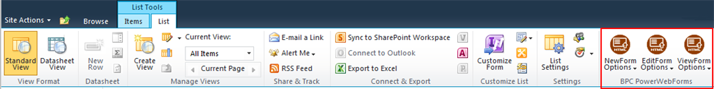 Registering PowerForms HTML to work with a Sharepoint list is a very easy process. All that is required is to navigate to the preferred list and then click on one of the buttons located on the far right side of the List Ribbon Bar.
