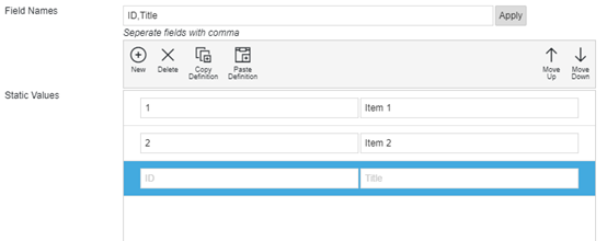 In the above example, a list of static rows with properties “ID” and “Title” is defined.